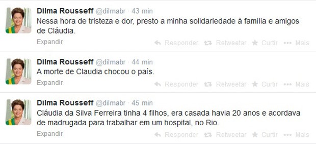 A presidente Dilma Rousseff escreveu nesta terça-feira (18), em sua conta no Twitter, que a morte de Cláudia Ferreira, que foi arrastada por uma viatura da polícia militar no Rio de Janeiro, "chocou o país".